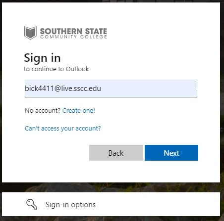 - When signing into your account you will first see the normal Sign in and Enter Password windows. Enter your SSCC @live.sscc.edu email address and select 'Next'. Then enter your password and select 'Sign in'.