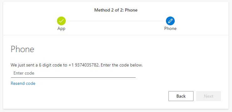 - You will then be prompted to set up a second method of authentication. Enter your cell phone number and select 'Next":
